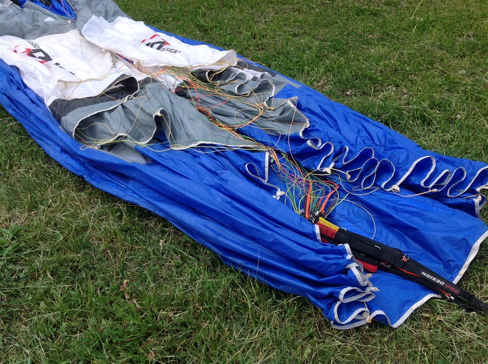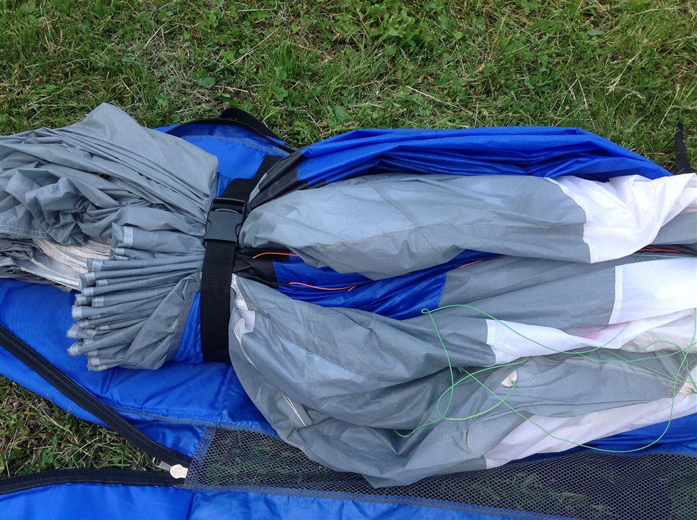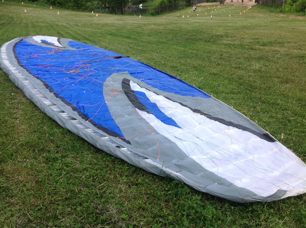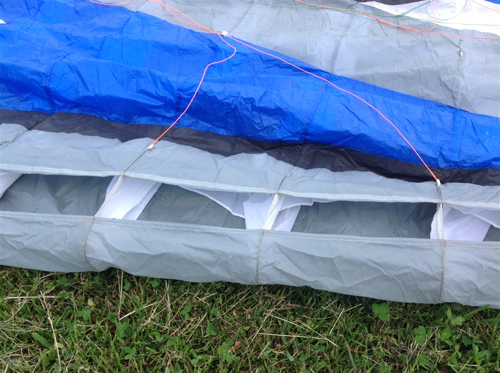 Состояние отличное. Бережная эксплуатация и хранение. В воде не купалось, на деревьях не висело. Стропы в идеале.