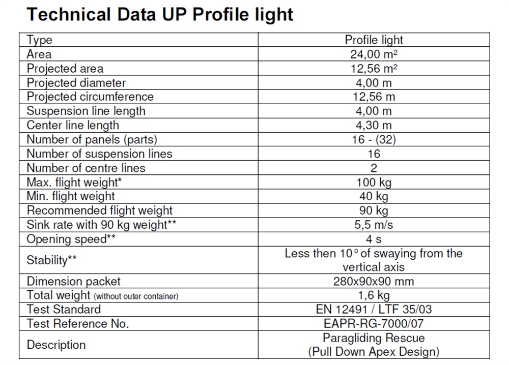 Запасной парашют внешний – UP PROFILE Light. Требует переукладки.