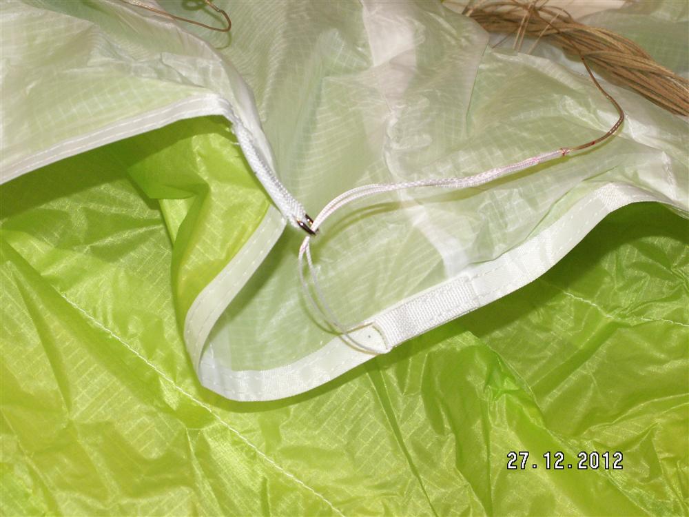 А это усиление, в 40 сантиметрах от задней кромки, вообще не понятно для чего, просто вставлена леска, длиной чуть больше метра, её плохо видно на фотографии, рядом с ней я положил шнурок.