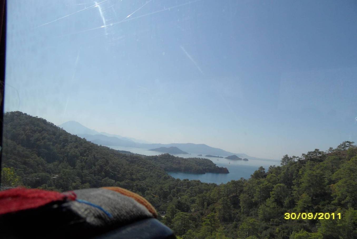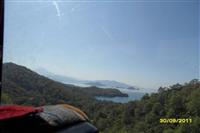 Примерно после часа поездки в окна автобуса мы увидели море. Его первое появление совпало с тем, что мы стали переезжать очередной перевал. Слева от нашего автобуса были отвесные горы, а справа обрыв, вдали показалось море, утопающее в зелени, с небольшими островами в середине бухты. Красотища!!!
