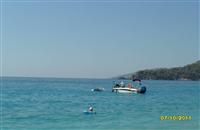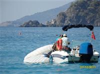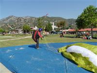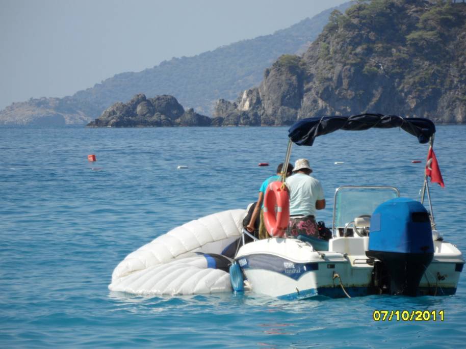 К нему сразу же подрулил катер спасения. Принял на борт сначала его, потом собрали и втащили купол. Выловили второго «утопленника», как их обычно называли. Второй, коллега Сергея по СИВ-2, приводнялся не так комфортно. Он был вынужден выбросить запасной парашют и в воду входил, как и положено на запаске. Все эти события мы наблюдали с земли. Было не до конца понятно кто и что, но потом, переспросив у инструктора, все стало на свои места. Но главное, успокаивало, что все приводнились без травм. Для Сергея это было особенно актуально, так как за две недели до поездки он на полетах сломал ребро и физически был не совсем в форме. Помогать с выгрузкой из лодки Сергею не пришлось. Когда мы с Лидой подошли купол с подвеской был уже на берегу. Оставалась надежда, что запасной парашют не промок. Увы. Распаковав контейнер, убедились – вода везде. Все мероприятие спасение (100 лир) промывка параплана и запасного парашюта пресной водой (до 75 лир, но можно торговаться) турки делали быстро и даже с некоторым удовольствием. Для них это заработок, т.е. небольшой бизнес. Иногда возникала даже некоторая конкуренция между спасателями. К одному «утопленнику» подходила пара катеров. Как они решали кто из них прав не понятно, но все происходило достаточно мирно.