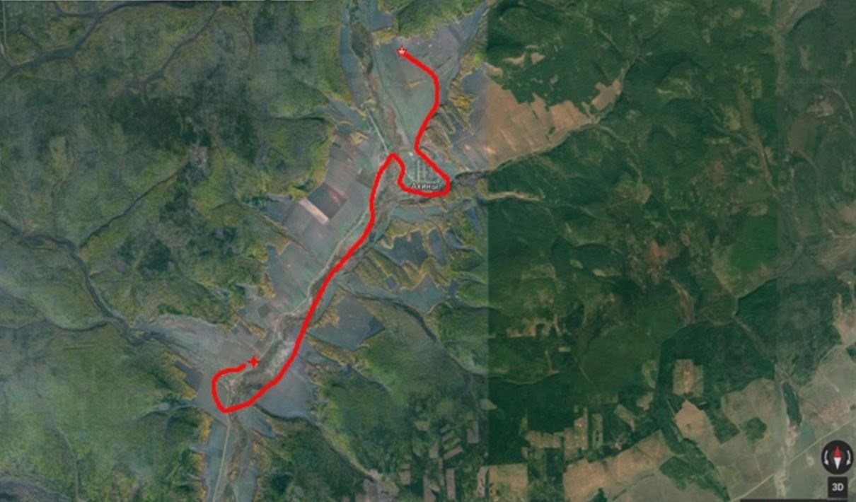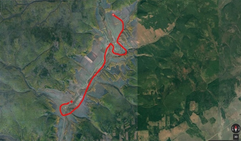 Визуальный контакт с машиной сопровождения установлен. Вперед по плану полета. С этим авто примерно ноздря в ноздрю мы и двигались километров десять. Я над речкой, а он по дороге. Стало немного смеркаться. Стал задумываться о посадке, но участок был неровный и подходящей площадки для посадки не находилось. Опять же рассчитывал на то, что сяду перед авто, что бы ему не возвращаться. Ушел немного влево с набором высоты, чтобы срезать по прямой зигзаг дороги и поискать посадку перед авто. Каково же было мое удивление, когда после того как стал снижаться подтягиваясь к дороге автомобиль вместо того, чтобы скинуть газ и меня подождать, вдруг прибавил обороты и быстро стал двигаться от меня в сторону Байтога.
