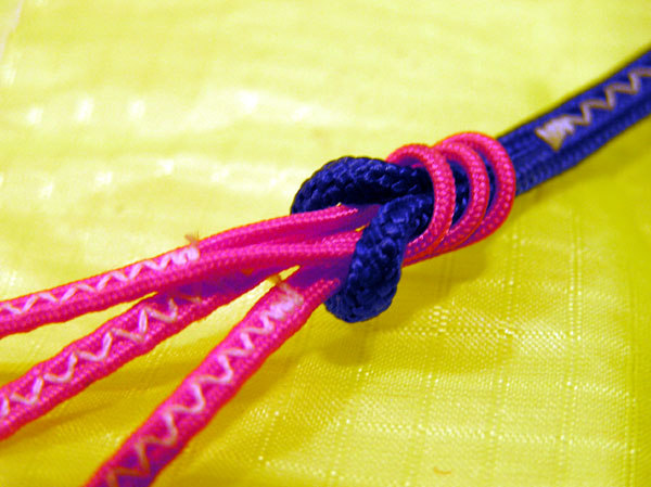 2. Стопорный узел – петля удавка – основное быстроразъёмное соединение несущих и управляющих строп на любых типах кайтов. Такое соединение обеспечивает быструю отцепку и замену, а при необходимости и регулировку длины всех основных строп в полевых условиях.