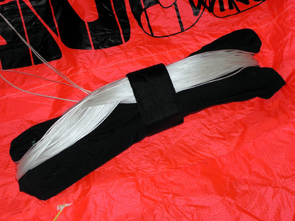 Прежде всего, это тканевое крыло-оболочка. К ней крепится система купольных строп, которые тремя каскадами, как водные ручейки, "сливаются" в четыре длинные стропы. На противоположном конце каждая пара этих строп соединена со своей ручкой управления. Весь этот нехитрый наборчик в сложенном виде умещается в маленьком рюкзачке и весит около 1,5 кг. Вот и всё... А теперь более подробно.