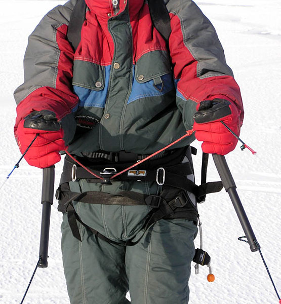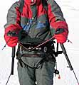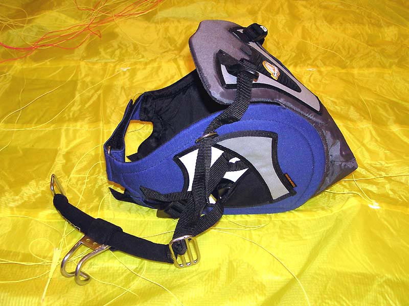 Остановимся на "сидячей" трапеции, более оптимальной для фрирайда на лыжах (да и на борде тоже). В этом варианте центр тяжести тела очень близок к точке приложения тяги, нагрузка на туловище менее интенсивна. Вообще, "сидячки" по своей сути смахивают на скалолазную беседку, с той лишь разницей, что ваша "пятая точка", поясница и бёдра более ласково охватываются (словно шортики) и защищаются от возможных ударов специальными протекторами, которые вшиты с боков и на спине. Протекторы обычно полужёсткие, могут иметь специальную подушечку под крестец и приподнятую спинку, сзади может быть пришита специальная страховочная ручка для удержания кайтера перед стартом в сильный ветер, возможны вариации ременных схем фиксации ножных обхватов, поясницы и ролика (крюка), применяются высококачественные износостойкие ткани, вставки-жёсткости и т.д. Понятно, что всё направлено на то, чтобы комфортно, без акцентированного сдавливания длительное время (или кратковременно в перегрузке) воспринимать буксировочную тягу и равномерно распределять её на область таза.