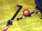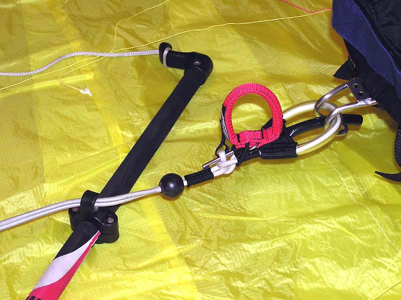 Всё бы неплохо, но уж очень тяжело рукам долго удерживать работающий кайт. Их надо разгрузить. Для этого с обратной стороны ручки, к продолжению репшнура несущей стропы, крепится короткий репшнур-узда. Его назначение: соединить обе ручки между собой и, таким образом, полученную уздечку можно накинуть на специальный ролик трапеции, надетой на ваш пояс. Тяга кайта снимается с рук и через трапецию передаётся на туловище. Рукам остаётся только управлять кайтом.