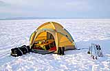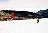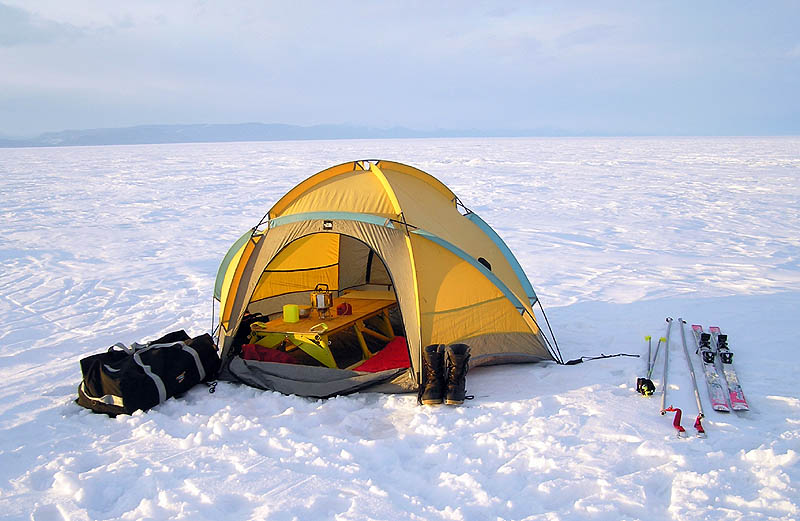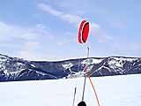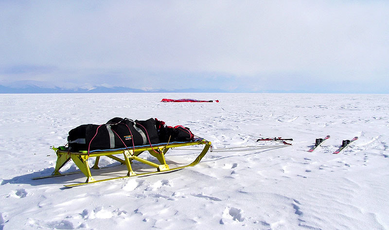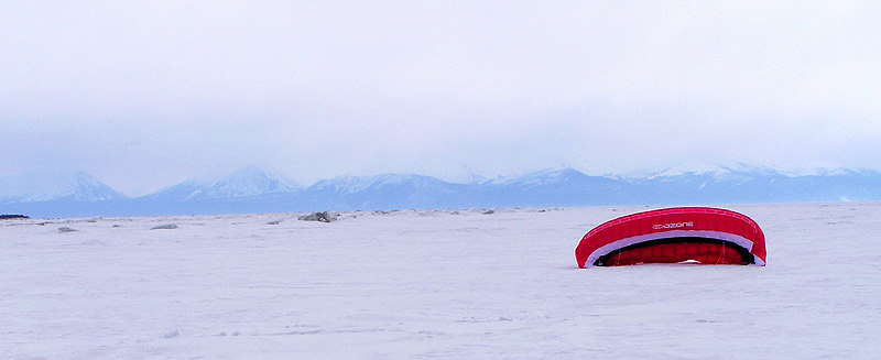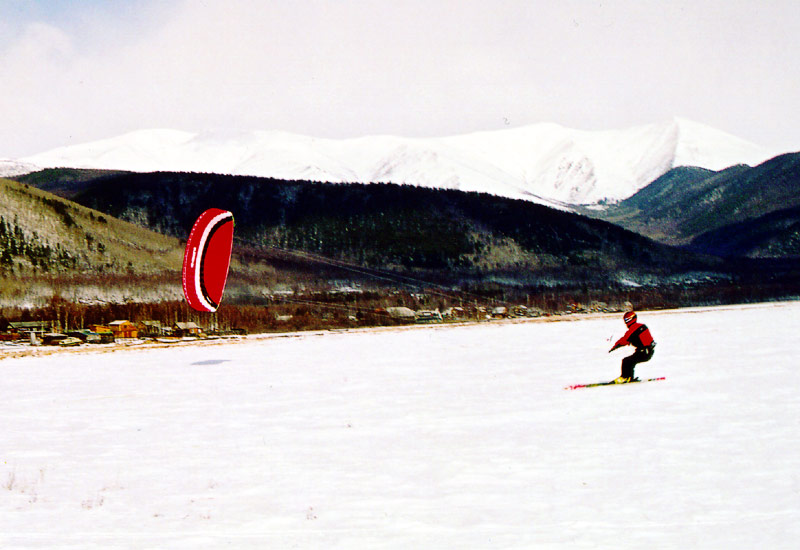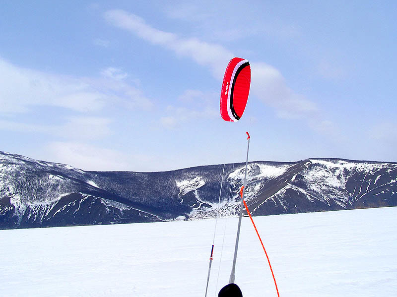 Неожиданный порыв противоположного направления не дал мне опомнится. Кайт резко перелетел в противоположную сторону и стремительно взмыл в небо, таща меня и нарты за собой. Всё бы ничего, но нарты и я в это время были направлены в противоположную сторону и от резкого рывка в рыхлом снегу нарты перевернулись, ботинки выстегнулись из лыжных креплений. Меня протащило по снегу ещё несколько десятков метров, пока я смог завесить кайт в зените над головой. Вот он первый привет от байкальских ветров – приложило как чайника. Самые очевидные действия в таких условиях – отстегнуть нарты от трапеции и уложить змея на снег. Зацепив его за оглобли нарт, я сходил за лыжами и всё вернул в нормальное положение. Теперь отправление моего "паровоза" прошло отлично, и я уверенно направился к устью Кичеры.