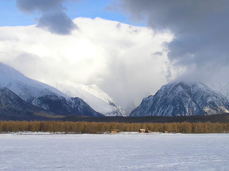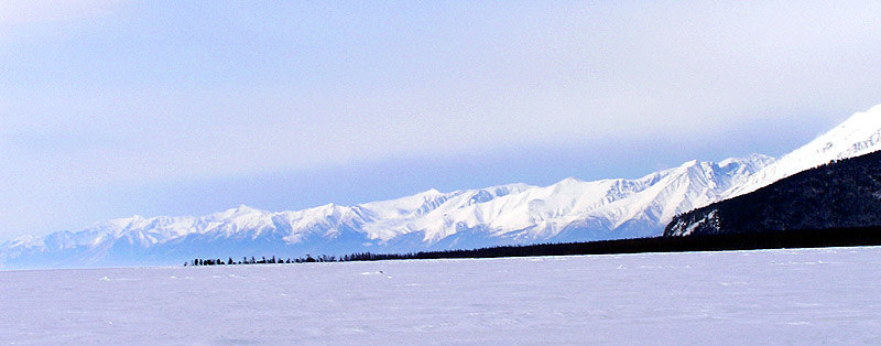 Утро тихое, теплое. Вытащил нарты подальше от полосы мысовых торосов на ровный снег. Дует слабенький култук – потихоньку поехал от базы. В этом месте, у мыса Котельниковского, пологий прибрежный хребет меняется. В верховьях реки Куркула находится гора Черского 2588 м (высшая точка хребта). Во всей красе дальше на юг раскинулся Байкальский хребет – высокие заснеженные гольцы со скальными гребнями, глубокими каньонами и распадками, опускаются к берегу предгорными склонами, поросшими лиственницей.