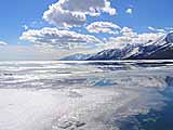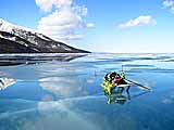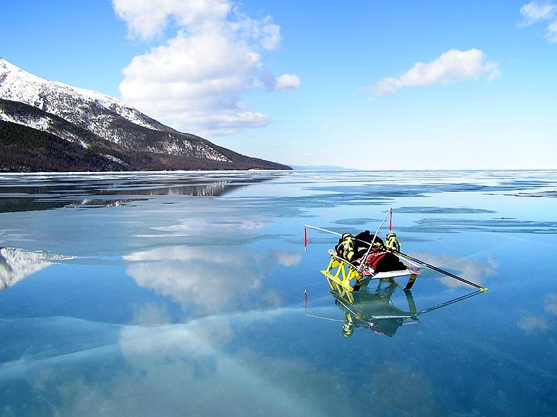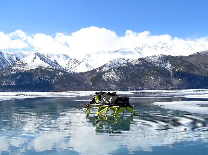 Распрягаюсь и переодеваюсь. Слой воды кругом 5-10 см, в торосовых чашах ещё глубже. Под прозрачным слоем воды почти не видна ледовая поверхность. Сейчас запросто можно проделать известное библейское чудо, жаль, что со мной нет напарника и сфотографировать этот фокус некому. Опираясь на лыжные палки, по воде аки посуху бодро шагаю в сторону мыса Елохин, который уже недалеко. Нарты почти не чувствуются, они легко плывут по мокрому льду. На Елохине находится кордон Байкало-Ленского заповедника, а значит можно устроиться на ночь и просохнуть. Настроение хорошее, красотища кругом...