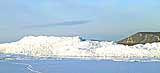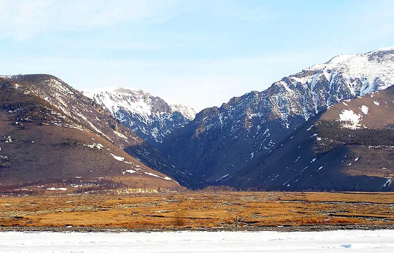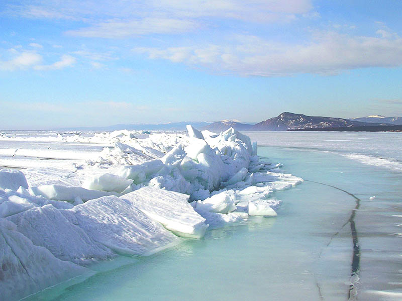 От места ночёвки до Хужира осталось 90 км. Чувствую, что сегодня я буду ночевать у Никиты, поэтому встал пораньше. Бреду к мысу Рытому, снимаю рассвет над Баргузинским хребтом. У маяка на мыс нажало целый бастион льда высотой до 5 метров. Прохожу мимо таинственного ущелья злых духов на Рытом. Уж сколько всякого понаписано про это место и как суеверно боятся его буряты. Не знаю как с духами, но открытых ледовых щелей шириной больше полуметра здесь действительно много. Подобно ледоколу изогнутая береговая линия и огромный мысовой клин глубоко внедрились в акваторию. Несложно догадаться, что ледовые напряжения всей центральной части озера сходятся именно в этом поворотном месте, из-за этого здесь большой ледовый нажим и щели.