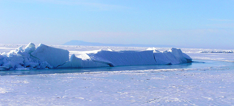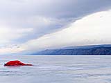Бреду дальше. Вот и первая становая трещина, проходящая от Кочерикова к Ушканам. На удивление она почти вся сухая и нет проблем её перейти. За ней открывается гигантский ледовый каток к Малому морю. Да, прогноз верен, над гребнями собираются уже хорошо мне знакомые облачные шапочки – предвестники горной. Уже три часа дня, нахожусь в нескольких километрах от берега напротив села Кочерикова. Небо над западным берегом постепенно становится свинцовым, кругом всё предательски стихает. Ну, мы то теперь не лыком шиты, и наш нынешний девиз – лучше быстро ехать, чем долго топать!