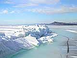 Ветер постепенно слабеет, начинаются периоды передышки. Я доворачиваю ещё левее и вхожу в Малое море примерно посередине, выдерживая направление курса по навигатору на Хужир. Впереди показалась большая ледовая баррикада – это становая трещина между северной точкой Ольхона мысом Хобой и материковым мысом Арал. Ого, да здесь серьёзные проблемы. 3-4 метра настоящего разлома частично забитого торчащими льдинами. Ветер уже здорово подстих, видимость начинает улучшаться. Убираю маленький кайт и ищу переправу. Бреду вдоль трещины в сторону Хобоя, ничего обнадёживающего не вижу. Неужели придётся выбираться к Аралу и по берегу переходить? Ветрового времени осталось уже немного, облачные барашки над гребнями начинают распадаться и уходящие бесполезно минуты сейчас особо драгоценны.