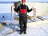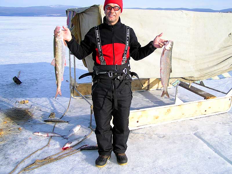 Быстренько раскладываю большой кайт и дальше. Я проехал на остатках горняшки от трещины ещё 18 км и ветер окончательно стих. Шесть часов вечера, ярко светит вечернее солнышко, в голубом умытом небе играют белые пушистые облачка, в природе очередное умиротворение. Позади сегодня пройдено 60 км под кайтом плюс15 км пешком, до Хужира ещё осталось 15 км. Стою напротив мыса Будун, а рядом рыбаки вынимают из сетей рыбу. Немного досадно, что потерянных у трещины полчаса мне и не хватило, чтобы нормально доехать до Шаманки, значит не судьба.