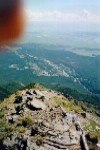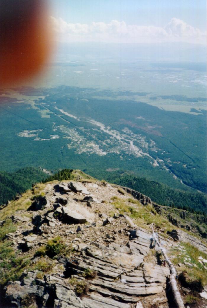 На вершине безветрие, жарко, от скал парит. Периодически на старт приходят спокойные термические пузыри. Группа туристов-школьников сидя на вершине с интересом смотрят на мой довольно большой рюкзак, не понимая, зачем я поднял его сюда. Обычно отдыхающие и туристы поднимаются сюда налегке, совершая однодневную прогулку-восхождение в зону гольцов.