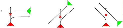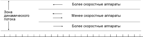 При парении в динамике нескольких разнотипных и разноскоростных аппаратов неизбежно возникают ситуации расхождения не только со втречными, но и с попутными аппаратами (один догоняет другого). Возможны следующие варианты действий догоняющего в соответствии с приведенным рисунком: