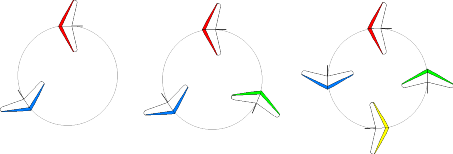 При обработке потока несколькими аппаратами приблизительно на одной высоте аппараты должны занимать равноудаленные друг от друга положения в спирали. Если в спирали находятся только два аппарата, то им рекомендуется занимать не диаметрально противоположные положения, а с некоторым смещением, чтобы исключить попадание друг друга в непросматриваемую зону от опущенного внутреннего крыла.