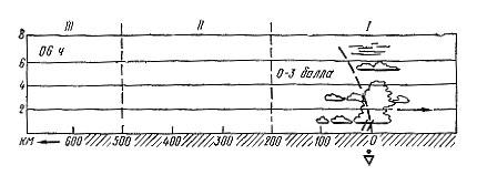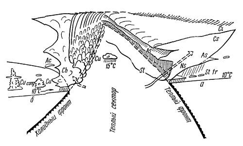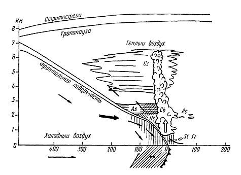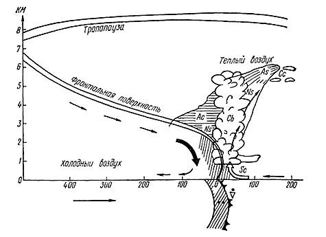 Зона облаков и осадков (см. рис. 1) в системе теплого фронта значительно больше, чем холодного. Общая протяженность системы облаков теплого фронта 700 — 900 км. Появление перистых облаков Ci, сменяющихся затем перисто-слоистыми Cs, — первый признак приближения теплого фронта. Давление начинает падать, постепенно усиливается ветер, который при наиболее частой ориентации линии фронта (от центра цикла, области пониженного давления) с северо-запада на юго-восток имеет юго-восточное или южное направление. Появляются высокослоистые As облака, переходящие затем в слоисто-дождевые Ns. Начинается выпадение осадков, давление продолжает падать. Усиление ветра, разрушающего приземный слой инверсии, способствует значительному согреванию воздуха задолго до прохождения фронта. Оно отмечается быстрым повышением температуры, резким поворотом ветра вправо (в нашем примере — на юго-западный), прекращением или резким ослаблением падения давления, прекращением осадков. Иногда температура за теплым фронтом бывает даже ниже температуры перед ним (летом в дневные часы). Это явление называется маскировкой теплого фронта. В предфронтальной воздушной массе летом в дневные часы могут наблюдаться кучевые облака Си. В метеорологии их называют также облаками “хорошей погоды”.
