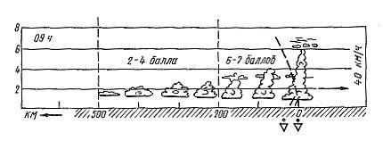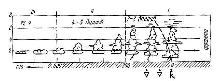 Мощные кучево-дождевые облака Cb — основная форма облаков холодного фронта. Они наблюдаются в виде узкого вала непосредственно перед линией фронта. При растекании из них могут образоваться в небольшом количестве перистые Ci, перисто-слоистые Cs, перисто-кучевые Сс, высоко-кучевые Ас и слоисто-кучевые Sc облака, а под ними в зоне выпадающих ливневых осадков обычно наблюдаются разорвано-слоистые St fr. облака (“плохой погоды”). Иногда прохождение холодного фронта сопровождается грозами и шквалами. Ширина зоны перед фронтом, где наблюдаются кучево-дождевые облака и выпадают ливневые осадки, составляет 50—100 км. Такая зона может быть не сплошной, а ночью облака типа Cb могут вообще размываться, в чем одно из отличий холодных фронтов от теплых. Происходит это ’потому, что днем усиливаются конвективные движения в связи с прогревом подстилающей поверхности. На рис. 2 схематически изображено изменение интенсивности холодного фронта в течение дня.
