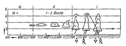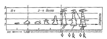 Дистанцию полета можно выбрать тем длиннее, чем раньше начнут образовываться кучевые облака, так как время действия восходящих потоков увеличивается. Наоборот, дистанцию следует сократить, если инверсия нарушится поздно Следует учитывать, что температура повышается неравномерно. За 1 ч она может возрасти на 1,5—3° С. Чаще всего над Центральной частью Европейской территории страны с 8 до 11 ч наблюдается прогрев на 1,5—2° С за 1 ч, после 11 ч — на 0,5—0,8 С. Таким образом, с точностью до 30 мин можно вычислить время образования первых кучевых облаков
