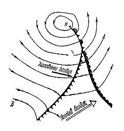Встретившиеся холодные и теплые воздушные массы все время движутся. Одновременно перемещается то в одну, то в другую сторону и разделяющая их фронтальная поверхность. В зависимости от того, какая масса “сильнее”, а следовательно, в какую сторону движется фронт, его называют теплым или холодным. На рис. 1 показаны разделы между холодными и теплыми воздушными массами.