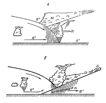 a — теплый фронт, б — холодный фронт.