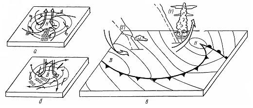 Вихревая форма циркуляции в циклонах и антициклонах определяется полем давления. В циклонах атмосферное давление наиболее низкое в центре, а к периферии растет. В антициклонах, наоборот, в центре давление наибольшее, а к периферии уменьшается. Течение воздуха в первом случае направлено против часовой стрелки от периферии к центру, а во втором — по часовой стрелке (в северном полушарии) от центра к периферии (рис. 7).