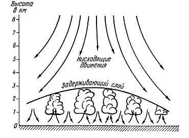 В теплое время года, когда близкий к поверхности земли слой воздуха достаточно нагрет, характерно понижение температуры с высотой, причем величина падения превышает даже 1 °С на каждые 100 м подъема. Зимой, при сильном охлаждении поверхности земли и приземного слоя воздуха, температура часто не понижается, а растет с высотой, т. е. возникает инверсия температуры. Подобные слои воздуха имеются в любое время года и на различных высотах. Слои инверсии и изотермии (температура с подъемом не меняется) играют важную роль в возникновении вертикальных движений воздуха и облакообразовании.