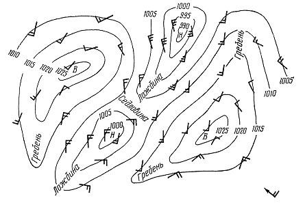 Кроме основных, различают еще промежуточные, или вторичные, барические системы с незамкнутыми изобарами ложбина — вытянутая в виде желоба от центра циклона полоса пониженного давления, располагающаяся между двумя областями повышенного давления; гребень (отрог) — вытянутый клином от центра антициклона и располагающийся между двумя областями пониженного давления; седловина — барическая область между двумя крест-накрест расположенными циклонами и антициклонами (рис. 10).
