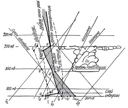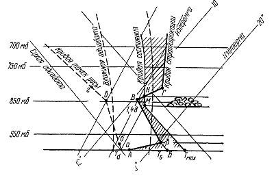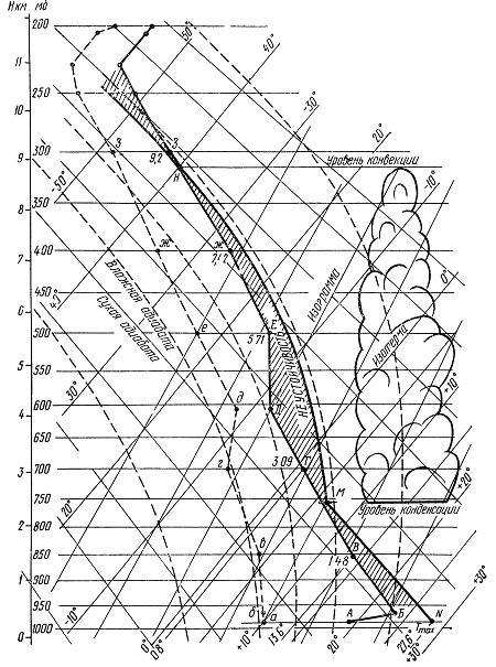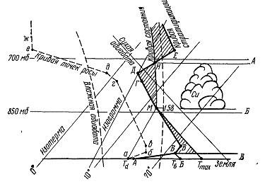 На рис. 13 — пример кривых стратификации и точки росы (кривой влажности) по данным зондирования. АБВГДЕЖЗ — кривая стратификации, абвадежз — кривая точки росы. Данные вертикального зондирования атмосферы приведены в табл. 4.