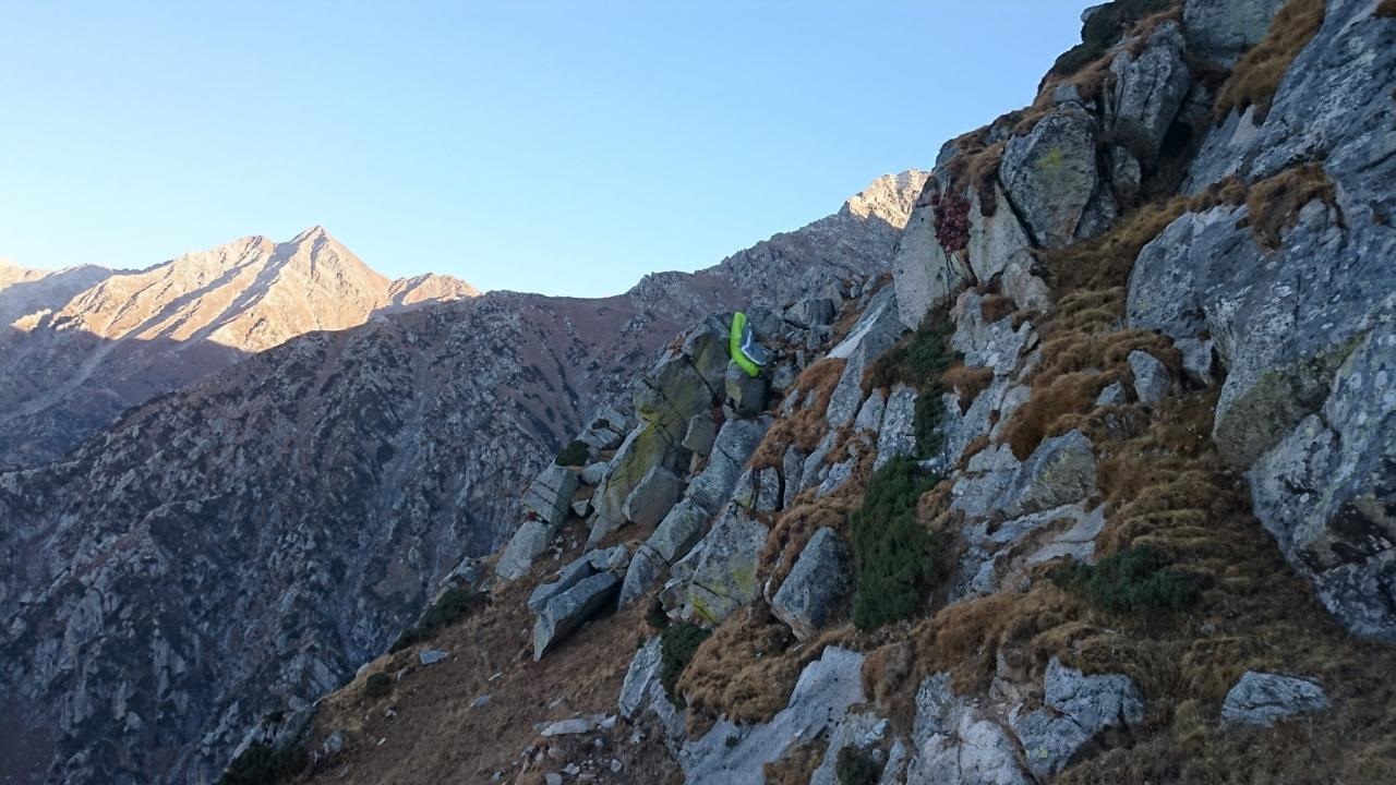 Так как я пришел сверху, то мы разминулись с Барри (он пошел по тропе, которая была практически рядом с ним, а я ее не увидел в тумане и сверху). Крикнув несколько раз, я услышал слабый возглас «Help». Оказалось, что Барри сам смог выбраться из подвески и пройти по звериной тропе, которая шла вдоль склона, около 200 метров (видимо в состоянии аффекта), там то я его и нашел уже изрядно замерзшего, сидящего на ветру. Пока бежал к нему, по следам крови на камнях, обратил внимание, что он часто отдыхал.